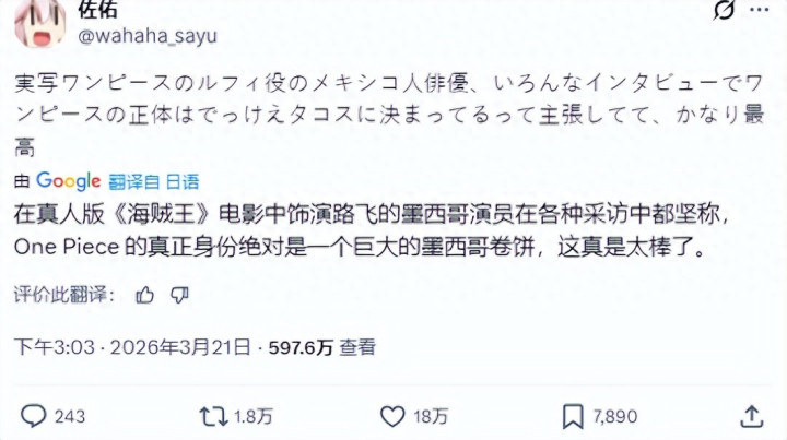 以至有幕后说法是,他在试镜的时分,因为推崇得太像路飞,凯旋把原作家尾田荣一郎逗笑了。