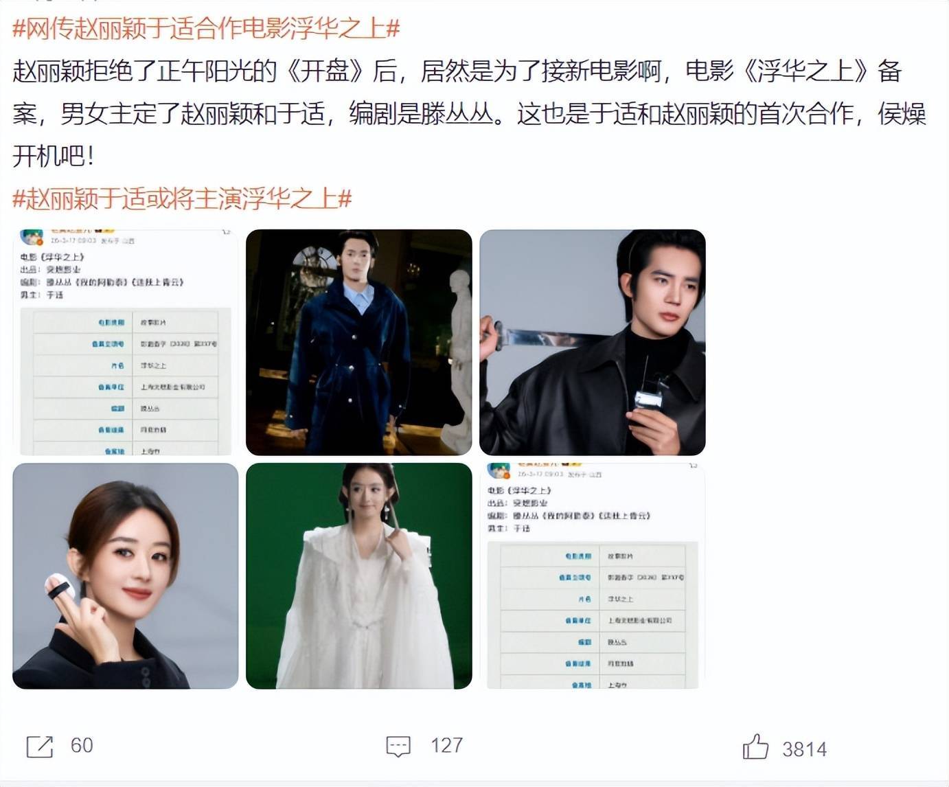 电影《浮华之上》编剧是滕丛丛,代表作有《我的阿勒泰》《送我上青云》。若编剧是她,于适出演可能性更大,毕竟此前和洽惬心。