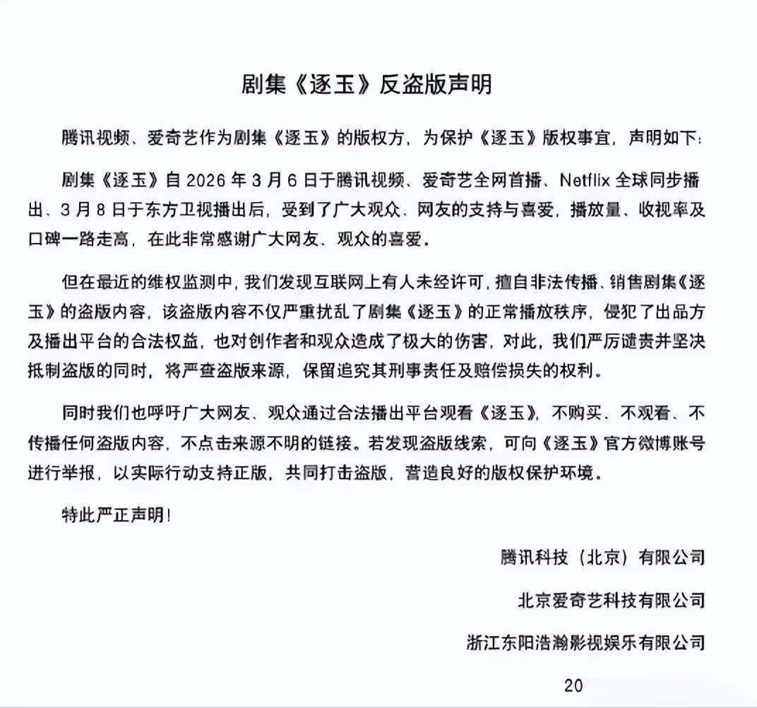 2026年3月21日,古装热播剧《逐玉》际遇大领域片源泄漏危境。剧集官方仅更新至30集,关系词40集全集资源却通过网盘肆意传播,高光桥段以及竣工大结局齐被所有曝光,部分资源致使还带有里面“审核”水印。此泄密事件倏地在全网激发山地风云,也将影视行业的版权痛点澈底表现了出来。