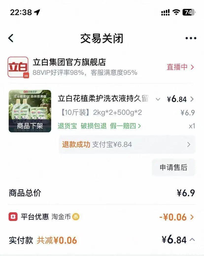 其提供的订单截图深入,10斤装的立白花植柔护洗衣液标价6.9元,不外当今商品页面深入“商品下架”。