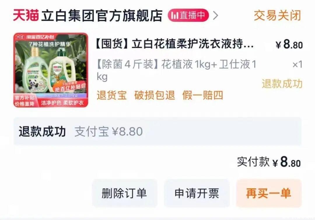 在外交平台上,还有消耗者反应,错标价钱的居品还有立白花植柔护洗衣液(除菌4斤装),标价8.8元,该订单也被官方退款。